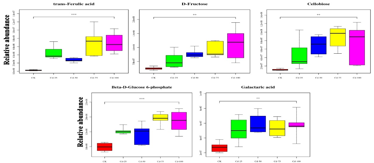 图4. Cd胁迫下参与细胞壁合成的差异表达代谢物相对含量变化箱式图