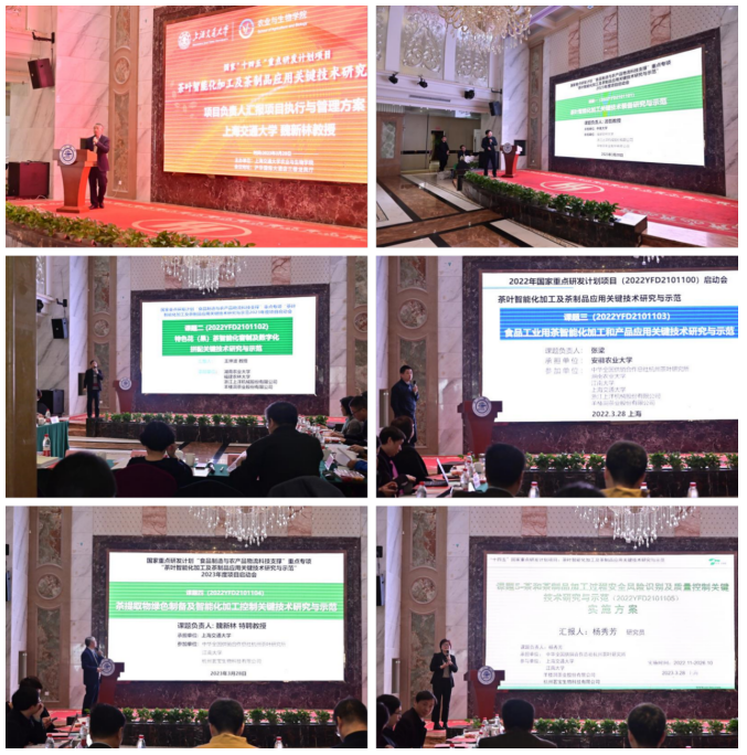 魏新林汇报了项目背景、研究内容任务分解、一体化实施方案、预期目标和亮点成果。各课题负责人围绕课题目标、任务分配、考核指标、进度计划、推进措施等内容分别进行了汇报。专项咨询专家组从课题实施方案可行性、技术路线、参加单位的协同攻关以及项目成果验证应用等方面分别进行了点评,指出该项目研究工作量大、难度高、涉及面广等问题,强调应重点在关键技术上有所突破,并真正应用于示范推广,提升我国茶和茶制品加工的智能化水平和高值化应用。